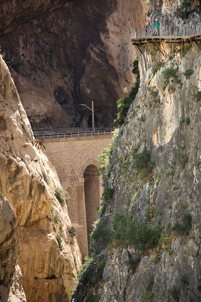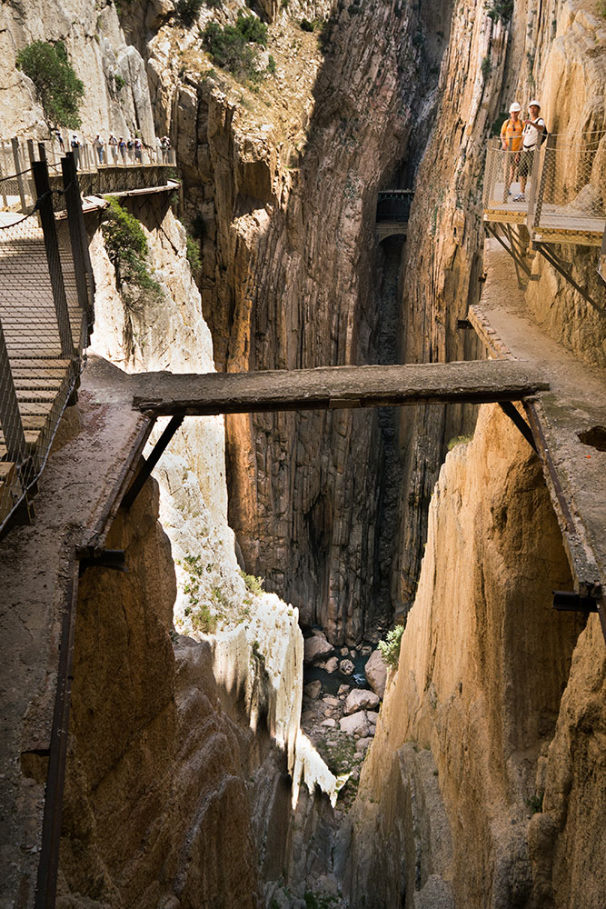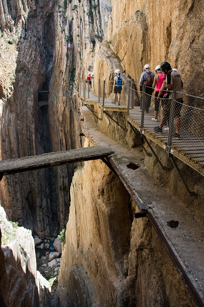 Mais le clou du chemin semble être une passerelle suspendue une centaine de mètres au-dessus de la rivière et dont le plancher en grillage ajouré ne laisse rien perdre de la perspective verticale de la gorge. L'ancienne passerelle, en fait une conduite d'eau équipée de deux rambardes, a été conservée à côté. Malheureusement, situé à proximité de l'entrée sud du Caminito, le lieu est particulièrement fréquenté et la foule qui s'y presse rompt un peu le charme de l'endroit. C'est, du reste, le seul défaut de cette belle randonnée : bien que l'accès en soit règlementé, le Caminito del Rey est un peu surchargé, surtout dans cette partie sud du parcours car il semble bien que beaucoup de visiteurs se contentent, en accédant par le sud, de parcourir cette première partie des gorges sans se donner la peine d'aller plus loin.