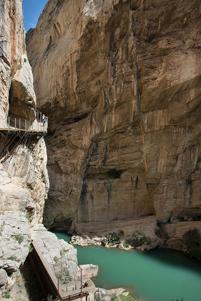 Un kilomètre et demi plus loin, nous abordons la partie la plus spectaculaire du Caminito. Cette gorge sud est une faille étroite de près de 300 mètres de profondeur. Accroché à la falaise, le chemin de planche semble bien fragile et que dire de l'ancien chemin, toujours en place quelques mètres plus bas ? Là, nous mesurons le courage (ou l'inconscience, mais pas forcément) des intrépides qui se lançaient sur ces dalles de béton, étroites et délabrées. Bien que beaucoup l'aient parcouru accrochés à une ligne de vie et en respectant les règles fondamentales de sécurité dans ce genre d'exercice, plusieurs plaques commémoratives jalonnent le chemin, témoins des drames qui justifièrent la fermeture du Caminito au début des années 2000.