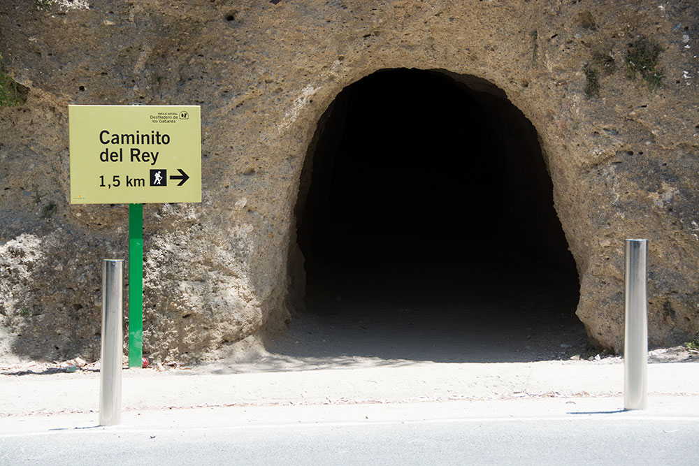 L'entrée sur le Caminito peut se faire par le sud, du village d'El Chorro, ou par le nord, sur la commune d'Argeles. C'est à cette entrée nord que nous démarrons notre périple. Pour atteindre le point de départ du Caminito, nous commençons par emprunter un tunnel pour piétons puis devons marcher sur une large piste pendant un ou deux kilomètres jusqu'à un petit lac de barrage où est installée la guérite de contrôle des tickets. Ceux-ci doivent se réserver à l'avance par Internet (www.caminitodelrey.info). Il faut savoir que, si l'entrée est encore gratuite, l'accès au chemin est limité pour éviter qu'il soit surchargé. Nous rencontrons cependant un groupe de 3 jeunes Français, venus le nez au vent et qui, placés sur une liste d'attente, parviendront à entrer sur le chemin au bout d'une heure ou deux.