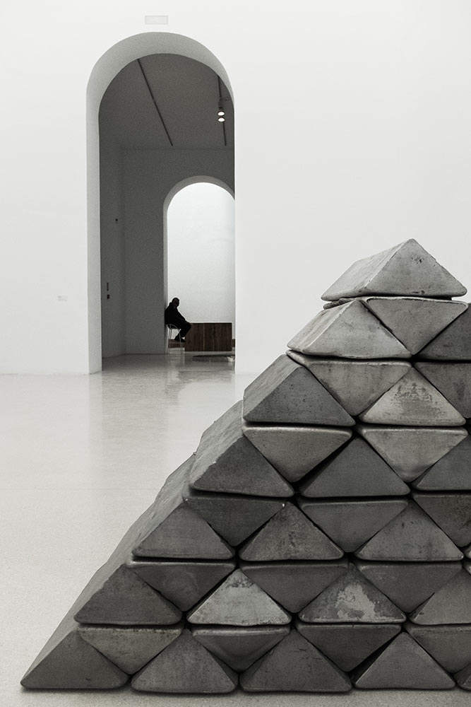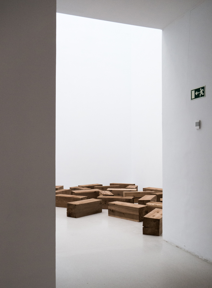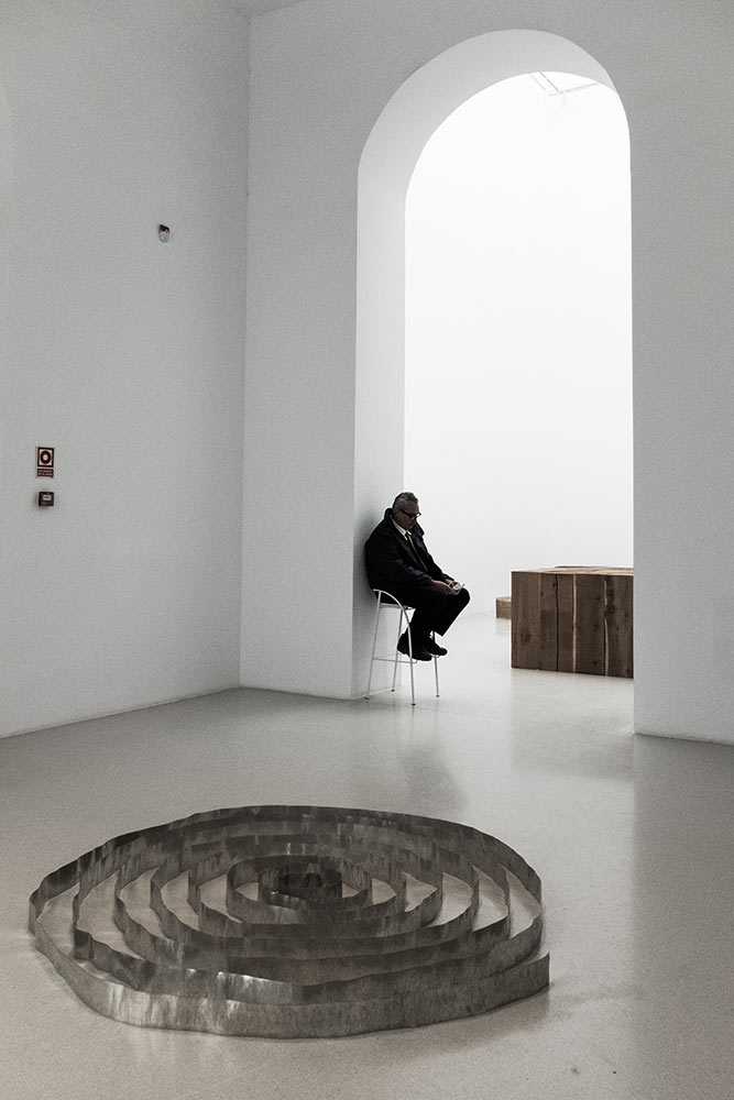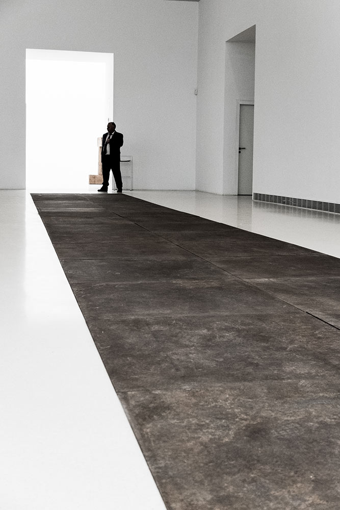 Exposition Carl Andre au palais Veslasquez. Dans ce lieu particulièrement dépouillé, l'oeuvre de Carl Andre crée des jeux de perspectives contrastés, ponctués par les silhouettes lointaines de gardiens et de visiteurs