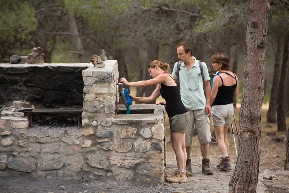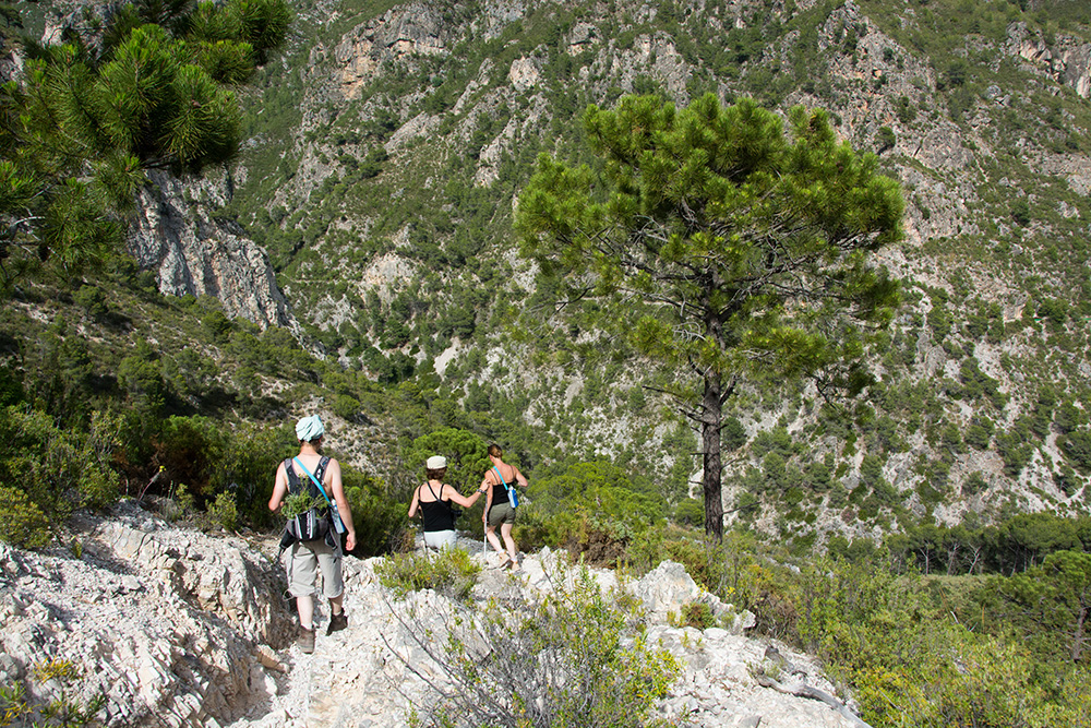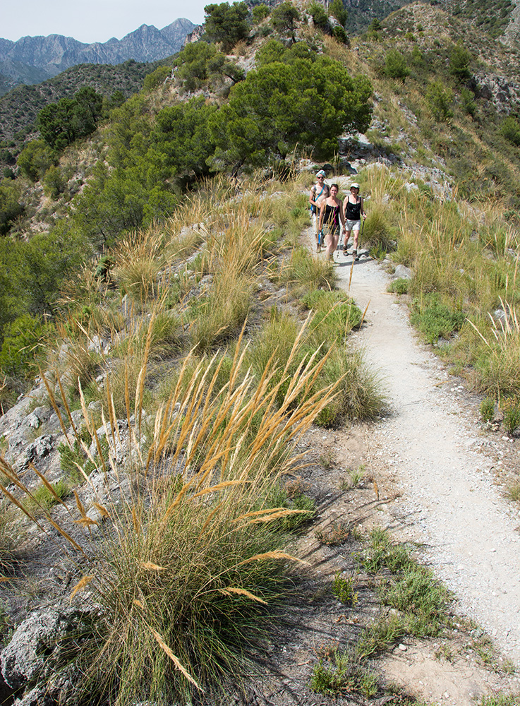 Passé cette première difficulté, nous nous retrouvons sur un chemin de crête, puis à flanc de montagne où nous progressons parmi les pins d'Alep, les buissons et les broussailles. Le paysage est doux, la montagne verdoyante. Mais survient l'évidence : il va nous falloir passer un second col avant de redescendre. Du chemin, nous apercevons la petite ville de Nerja... dans notre dos : le sentier s'enfonce de plus en plus dans les contreforts de la Sierra de Tejeda. Cette fois, cela devient un peu inquiétant car nous n'avons que 2 litres d'eau pour 4 et, le soleil étant revenu, nous voilà contraints d'improviser des cheks à base de T-shirts pour ne pas risquer d'insolation.
