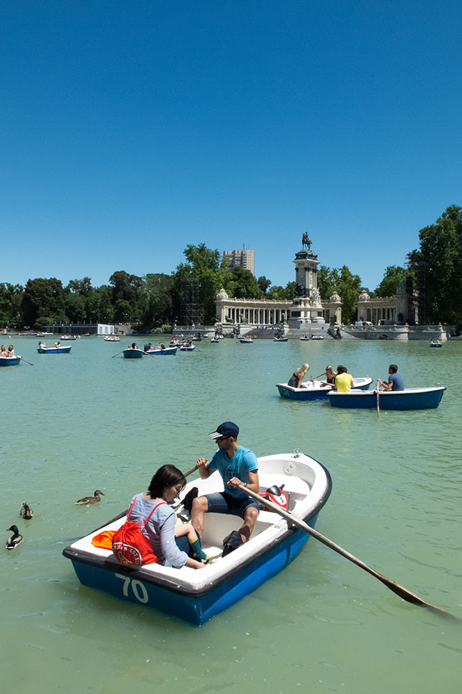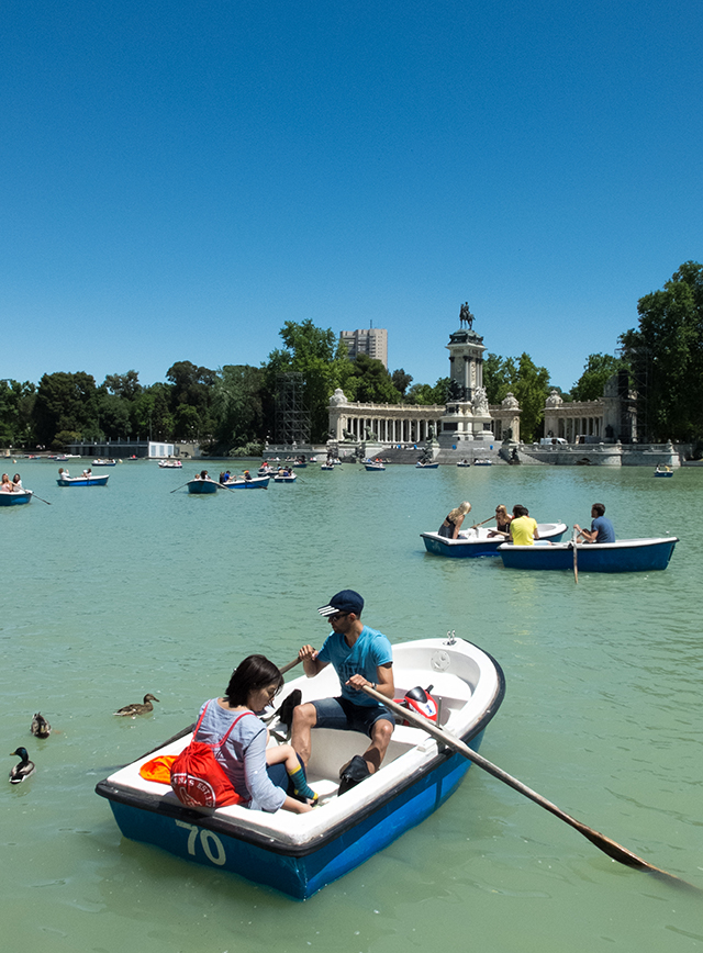 Le musée de la Reine Sophia est à 5 minutes à pieds de l'appartement. Sauf que voilà, nous sommes le 15 mai, jour de la San Isidro, patron de Madrid, et tous les musées sont fermés. Tant pis, ce sera pour demain. Il fait un temps magnifique et rien de plus naturel que de rejoindre, tout près, El Retiro, immense parc public situé au centre de la cité. Nous y déambulons parmi les arbres centenaires.
