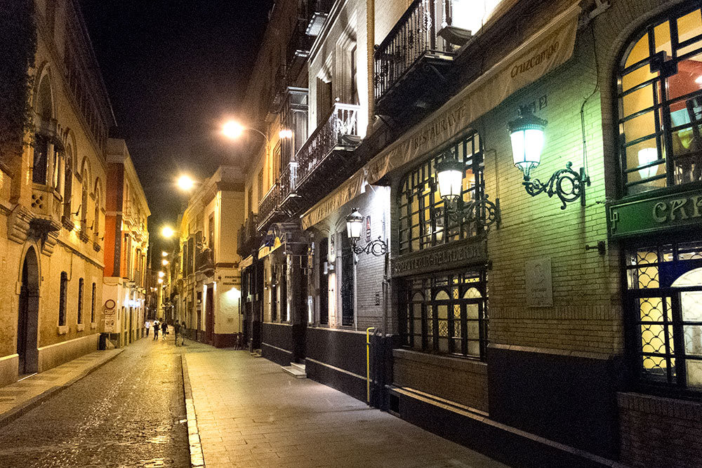 Nous ne sommes plus que trois. Le soir venu, nous nous baladons dans le centre. Séville est une ville où on sent qu'il fait bon vivre. Les terrasses des restaurants sont pleines, l’ambiance est joyeuse. Il faut dire que le temps de ce mois de mai est idéal : le soleil a brillé toute la journée, sans que le thermomètre ne dépasse les 25 degrés et une légère fraîcheur tombe avec le soir. Pour nous, ce sera soirée hamburger au Milonguitas, restaurant du quartier de la cathédrale.