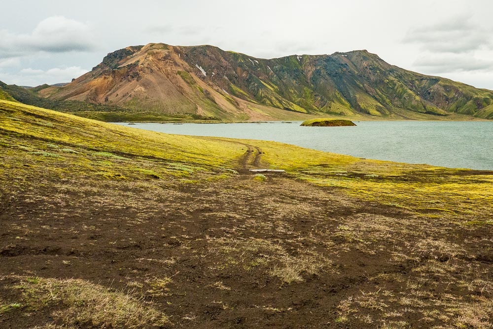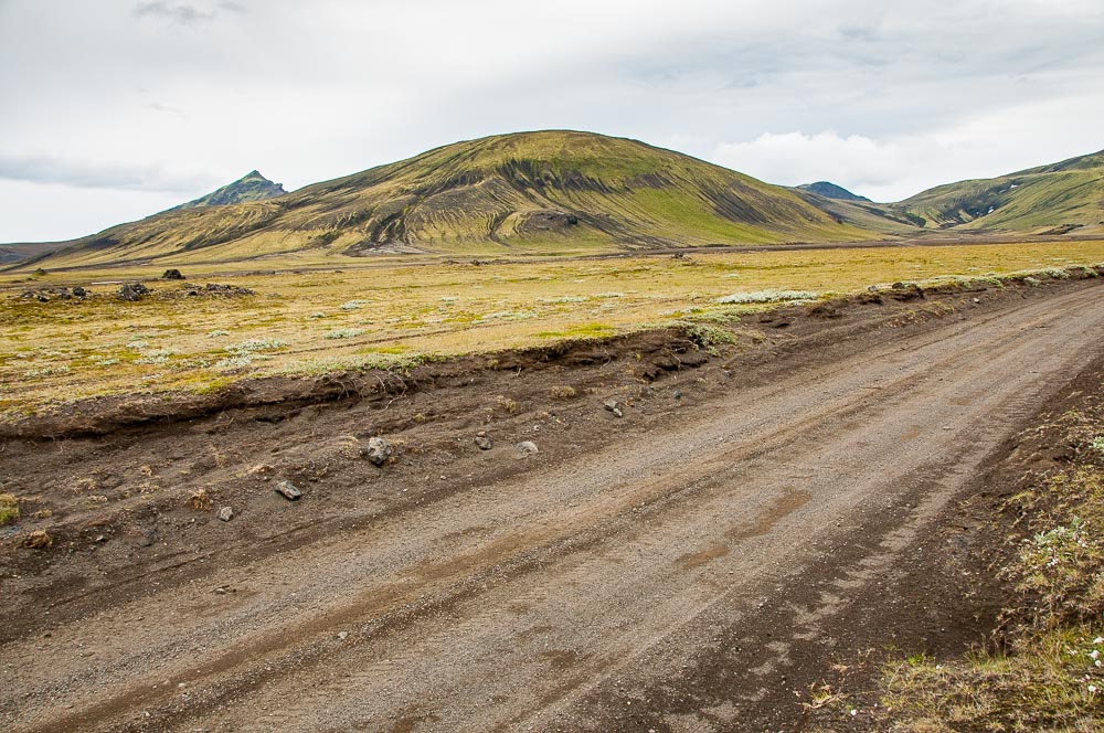 Cette piste mène au Landmannalaugar, une des plus belles et des plus spectaculaires régions d’Islande. Le départ se fait sur la route 26, au pied du volcan Hekla. La première partie traverse des champs de lave plus ou moins récents, dans un décor totalement minéral. Puis, en approchant du Landmannalaugar, les pelouses vertes apparaissent et le décor se compose alors de collines vertes parsemées de plaques de neige et laissant paraître par endroit la terre noire ou rouge, mélange de cendres et de minerais.